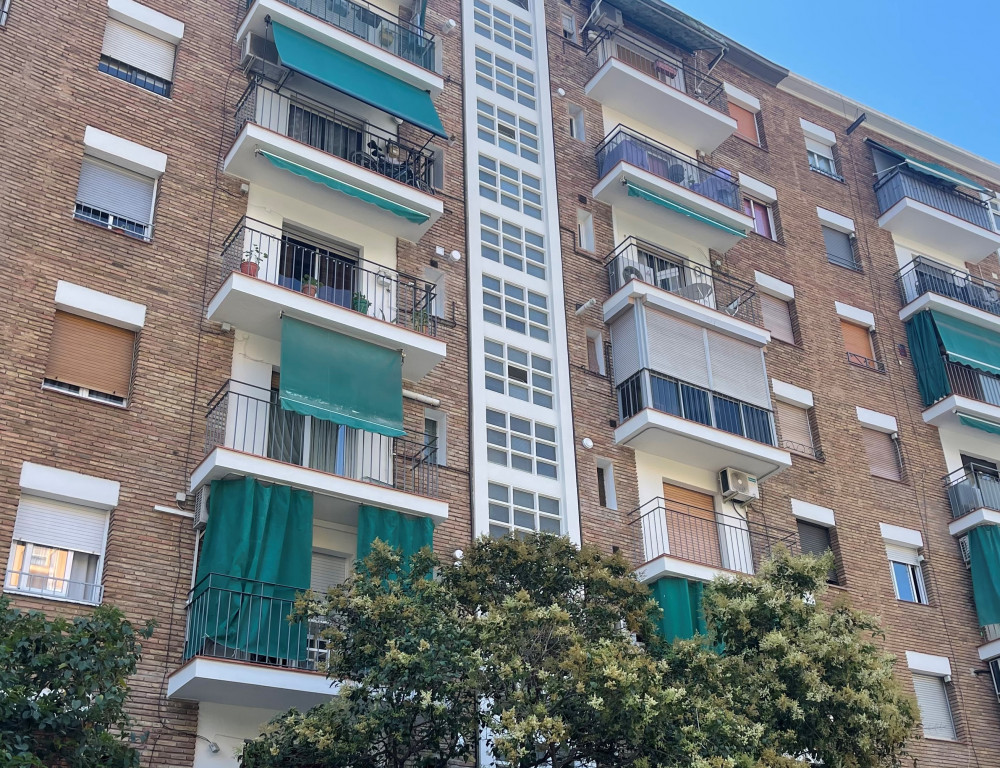 Rehabilitación de fachadas Barcelona: Mediante montaje de andamio tubular, derribo de suelo balcones, impermeabilización y colocación de nuevo pavimento. Reparación de barandillas, anclajes inox, añadido de pletinas de acero hasta 1,10 metros y esmalte. Pintura de fachada.