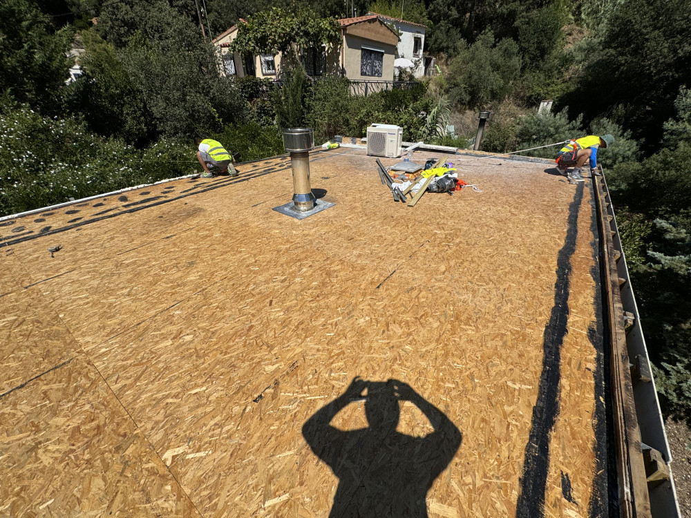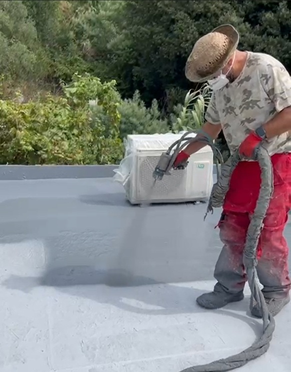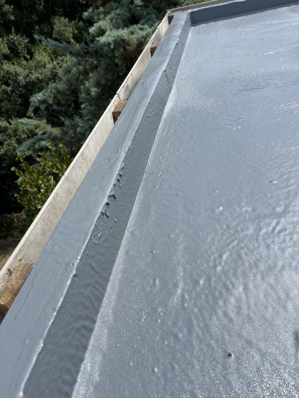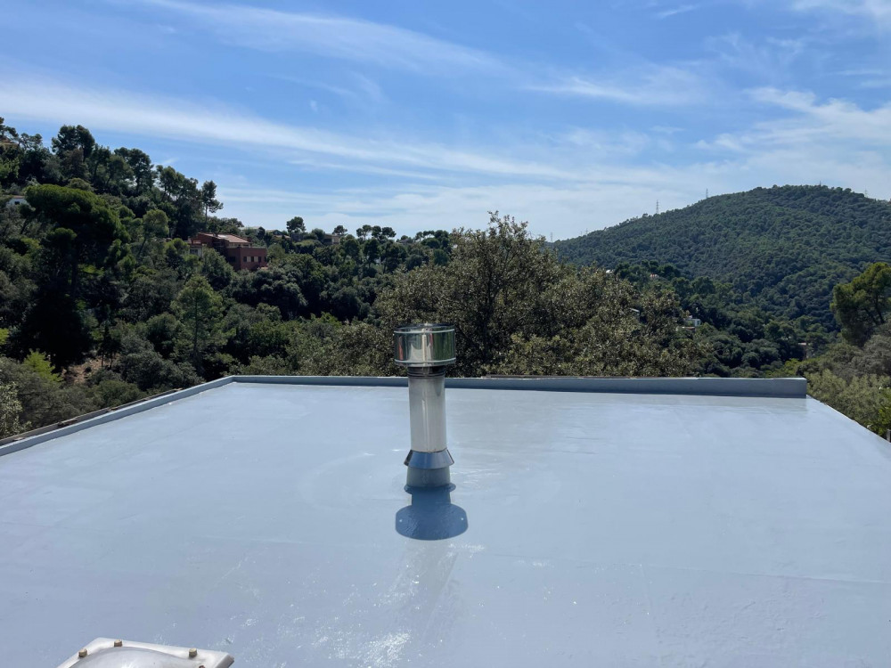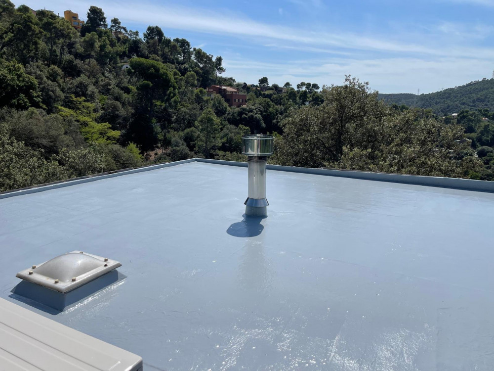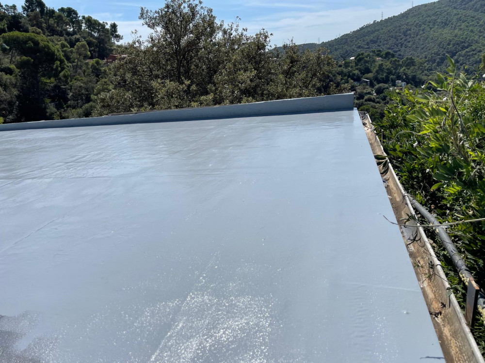 Poliurea en caliente en Barcelona: Impermeabilización de cubierta de OSB mediante derribo de lámina asfáltica existente. Reparación de cubierta plana y montaje de vierteaguas de aluminio en fachada Norte. Retirada, limpieza y reposición de cubremuros de aluminio blanco existente. Aplicación de imprimación. Aplicación de poliurea en caliente con un rendimiento de 2kg/m2. Aplicación final de protección solar Alifática color gris.